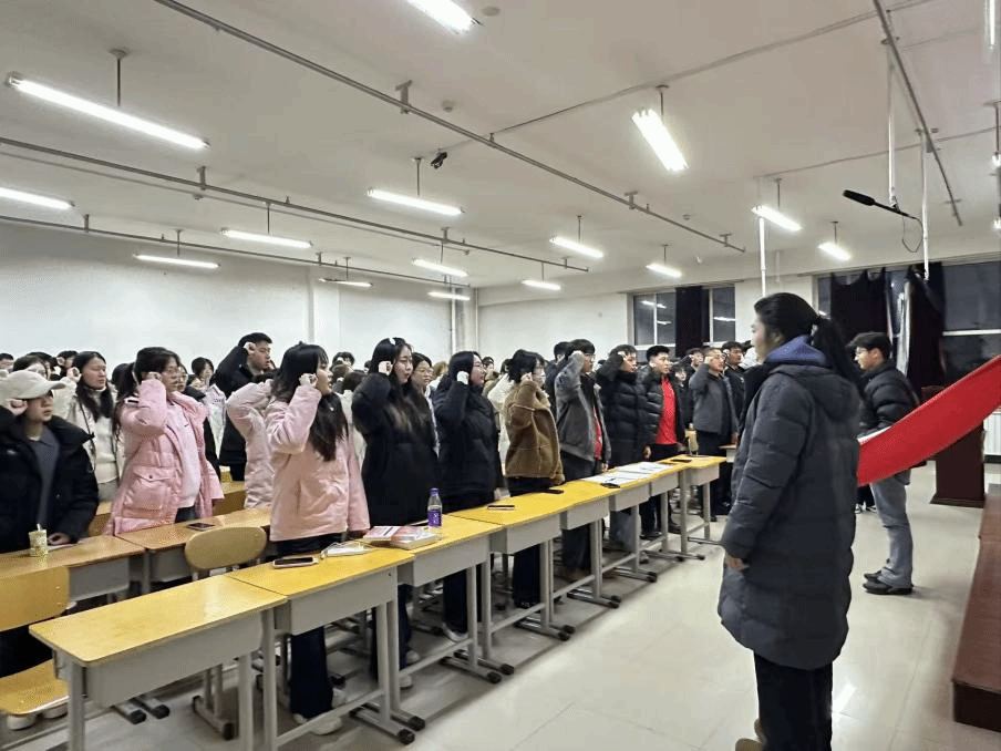 活动现场,氛围庄重而热烈。在退役复学大学生刘增的带领下,全体团员高举右拳,面向团旗庄严宣誓,重温入团誓词。铿锵有力的誓言回荡在活动现场,不仅是对入团初心的回望,更是对责任使命的承诺,进一步坚定了团员青年的理想信念。